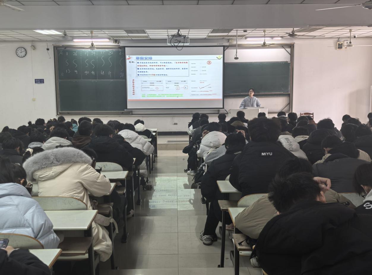 会上,辅导员带领学生回顾了本学期学习生活情况,指出不足,提醒学生要珍惜时间、做好假期规划,并就宿舍卫生、宿舍安全、交通安全、假期防范电信诈骗、寒假社会实践、离校手续等事宜做了详细布置。