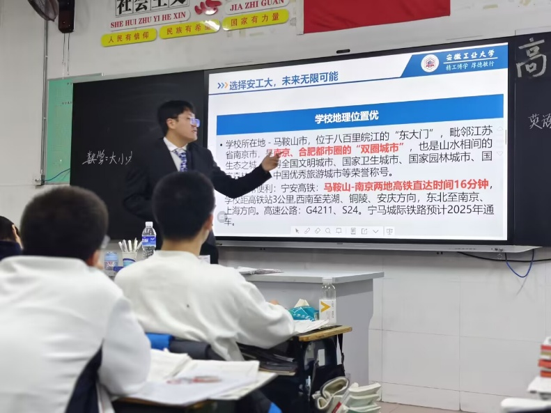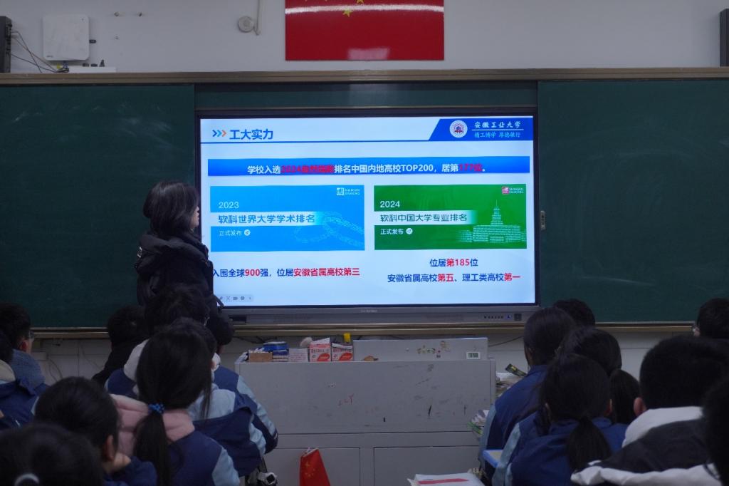 “我把工大带回家乡”百支爱校荣校实践团六安分队赴六安市第二中学进行宣讲。宣讲团成员杨庆乐同学以详实的数据和丰富的图片,全面介绍了安徽工业大学的教学资源和学术成果,用一场宣讲为学弟学妹们“种草”大学生活。