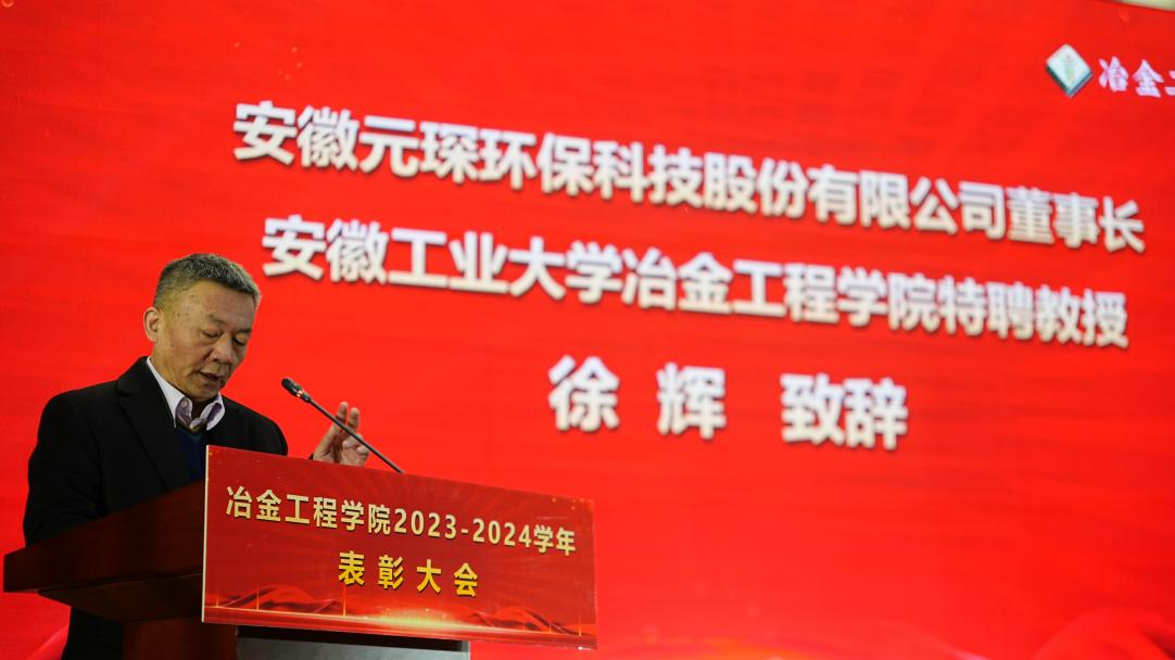 徐辉代表安徽元琛环保科技股份有限公司致辞,对学长期关心支持企业发展表示感谢,对获奖师生表示祝贺,并分享了自身的科技创新、技术研究的成果和经验希望进一步深化校企产学研合作,实现企业、师生多方共赢,欢迎更多的冶金学子加入元琛实现新一代青年的强国梦