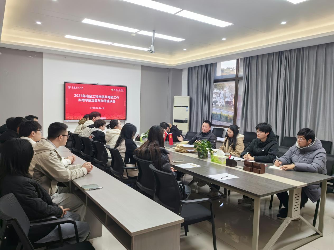 调研团学工作,并与学院师生代表在冶金楼南318会议室召开座谈会。校团委科技实践管理部部长滕少聪、昂昭玉,材料科学与工程学院团委书记邰子剑,院团委书记张夏以及30余名学生代表参加了座谈会。