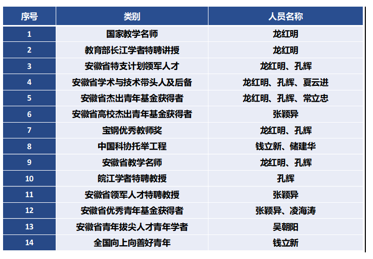 冶金工程系现有教师40人,具有博士学位37人,教授15人。其中国家级教学名师1人,教育部长江学者特聘讲授1人,省学术与技术带头人2名及后备人选1人,获皖江学者、安徽省“特支计划”人才3人,安徽省领军人才特聘教授1人,安徽省青年拔尖人才青年学者1人,中国科协青年托举工程人才2人,安徽省战略新兴产业技术领军人才2人 ,4人获得“中国金属学会冶金青年科技奖”“冶金先进青年科技工作者”和“全国高校冶金院长奖”,1人获“钢铁工业优秀科技工作者”。安徽省教学名师、教坛新秀各2人, 2人获得宝钢优秀教师奖,3人获得安徽省杰青项目资助,1人获安徽省高校杰青项目资助,2人获省优青人才项目资助。目前,全系保持着团结协作、氛围宽松、师资结构合理的学术环境,拥有省级教研创新团队4个,校级科技创新团队和校级教学团队各2个。