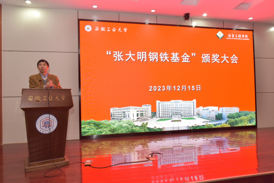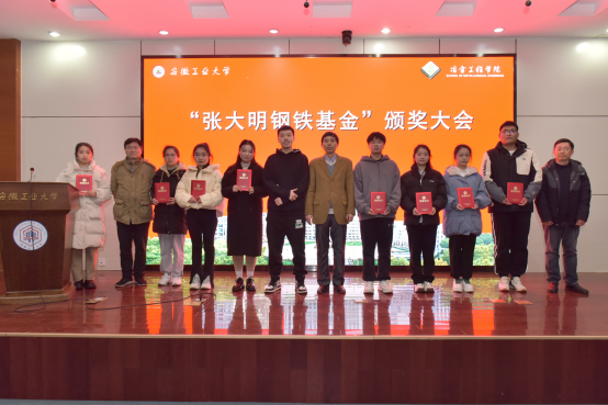 张大明为颁奖仪式致辞。他首先向受表彰的老师和同学表示祝贺,并指出,在过去的一年中,安徽工业大学的老师和学生们在科研、竞赛等方面获得很好的成绩,并勉励在场学生一要继续努力、提高综合能力,在学校百年校庆时成长为国之栋梁;二要学会感恩,在心底播种一颗爱的种子,在今后有能力的时候回报母校和帮助有需要的人。张大明还分享了自己在西藏等地的公益故事,与同学们一起观看了其参与的公益活动视频。会后,张大明与受表彰的师生合影留念。