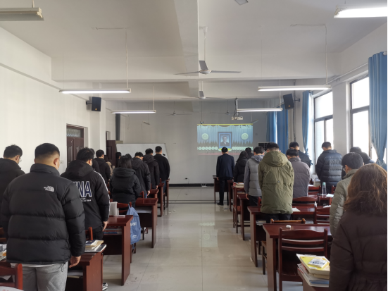 会议室内,气氛庄严肃穆,师生代表神情凝重,在哀乐声中,低头默哀,沉痛悼念敬爱的江泽民同志,并认真学习了习近平总书记在追悼大会上的悼词。
