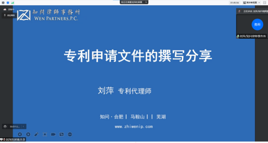 4月5日,污污漫画 第17期创新创业训练营邀请安徽知问律师事务所专利代理师刘萍,给同学们线上进行题为《专利申请文件的撰写分享》的培训,培训由训练营班主任吴巍主持。