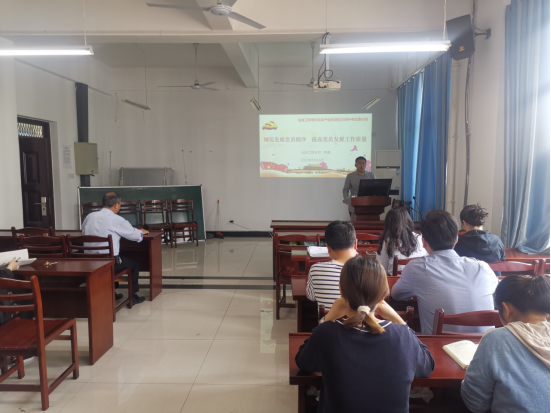 杨建传达学习了《安徽省普通高等学校发展党员工作实施细则》及《安徽工业大学发展党员工作实施细则》,从“入党材料撰写与审核”“发展党员的会议组织”“各环节注意把握事项”三个方面,详细介绍了发展党员工作程序和规范。