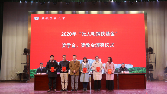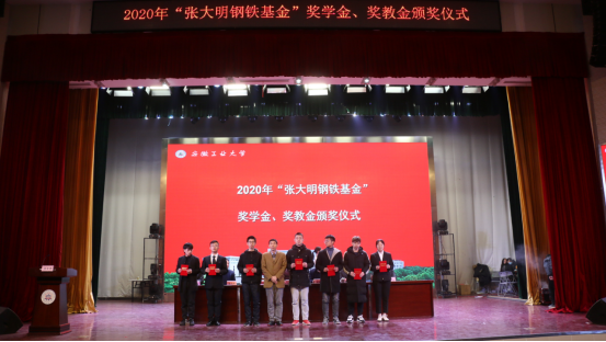 张大明为颁奖仪式致辞,宣读2020年“张大明钢铁基金”奖学金奖教金获奖名单,并为吴禧龙等7位学生颁发奖学金,为徐亮、李娜、田勇攀、陶素芬、吴婷5位教师颁发奖教金。吴禧龙作为受表彰的学生代表发言,张大明与受表彰的教师和学生合影留念。