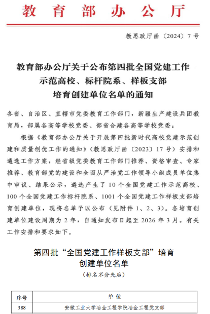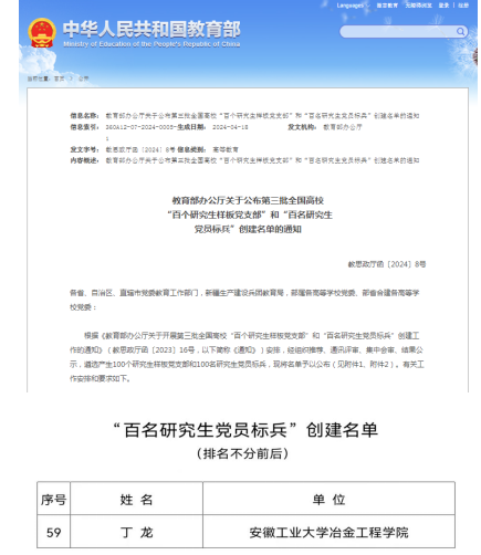 冶金工程党支部入选“全国党建工作样板支部”培育创建单位,丁龙同学入选“百名研究生党员标兵”创建名单。