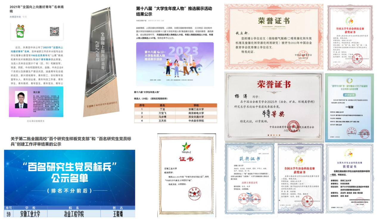 成果实施以来,培养了全国大学生年度人物、全国向上向善好青年、全国高校百名研究生党员标兵、中国大学生自强之星等一批国家级荣誉获得者。显著提升了研究生解决重大科技难题的创新能力,近五年培养的研究生深度参与国家重点研发计划、国家自然科学基金原创探索项目等等国家级科研项目,发表中国科学院1区论文63篇,授权国家发明专利45项,在挑战杯、中国国际大学生创新大赛、节能减排大赛、大学生冶金科技竞赛等赛事中获得国家级特等奖/一等奖20余项(图8)。