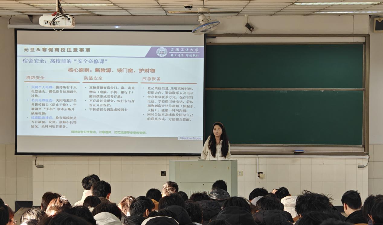 针对即将到来的寒假,辅导员传达了学校放假安排及相关管理要求,围绕人身安全、交通安全、消防安全、求职安全、饮食安全、防盗防骗、法治教育、自我健康防护等方面开展安全教育,提醒同学们切实增强安全意识与自我防护能力。会议特别强调,所有同学离校前须对宿舍进行彻底安全检查,务必切断电源、关闭水源、锁好门窗,从源头上杜绝安全隐患,确保假期校园与个人安全。