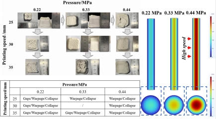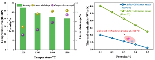 此外,团队利用增材制造技术制备具有低导热、高强及耐腐蚀的刚玉-莫来石质耐火材料,通过优化打印浆料流变特性(粘度、触变性),调控打印参数(压力、打印速率),改善坯体的打印结构精度(图3)。在此基础上,研究了不同煅烧温度(1200~1500℃)对刚玉-莫来石质耐火材料物相组成、微观形貌、抗侵蚀性及物理性能的影响。并采用Ashby-Glicksman(开气孔/闭气孔)模型对所制备的耐火材料的导热系数进行计算和预测(图4)。相关工作发表在《Journal of the European Ceramic Society》上,材料科学与工程学院李赛赛博士和污污漫画