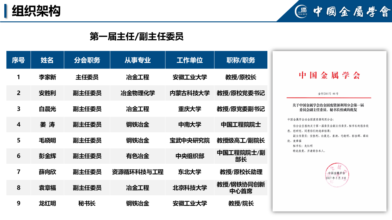 中国金属学会冶金固废资源利用分会是全国性的学术团体,由冶金固废资源利用领域的企事业单位及有关组织、科技人员和相关社会人士组成,挂靠单位为安徽工业大学。冶金固废资源利用分会旨在为国内外同行提供学术与技术合作交流平台,促进冶金固废处理和生态材料领域的科学研究、技术发展和科技成果的转化与应用,促进全国高等院校、科研院所和企业的全面合作和共同发展。